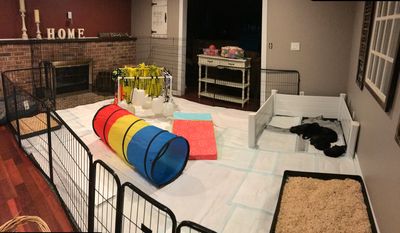 Puppies are moved to main living area of the house (from their quiet whelping room) into a bigger pen. This allows me to add more environmentals into their everyday life. They now have tunnels, an “environmental cube”, foam steps, tents and all sorts of fun, interactive obstacles to stimulate them.